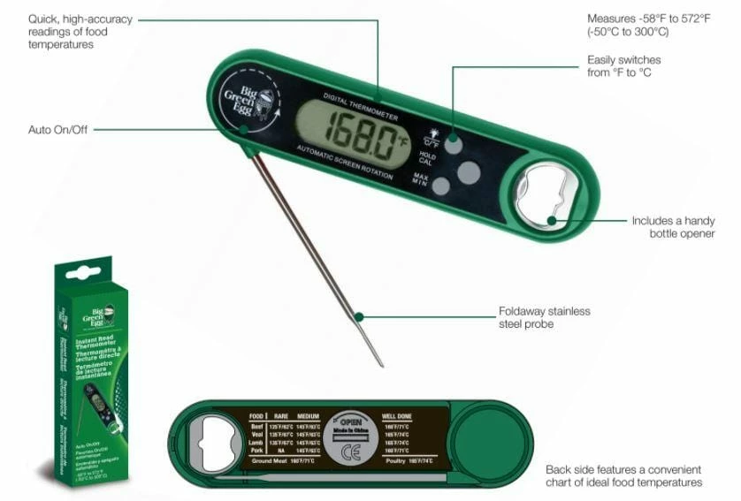 The Big Green Egg Instant Read Thermometer provides accurate food temperature readings in seconds! With the convenient chart of ideal food temperatures, you’ll never need to worry about over- or under-cooking your meals again.