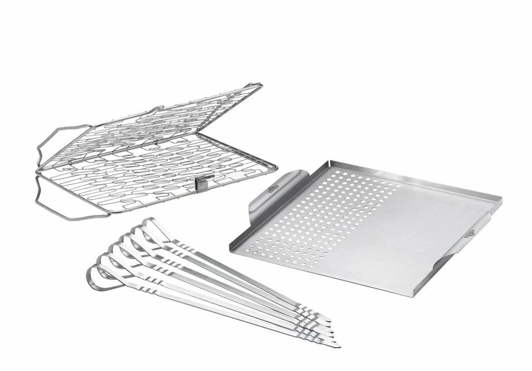 Making healthy choices when it comes to grilling a meal is even easier with the Napoleon Healthy Choice Starter Kit. The Stainless Steel Multifunctional Topper features two different sides, the perforated side is ideal for grilling veggies, while the flat side is perfect for searing delicate foods like fish and scallops, or cradling a wooden plank (not included) so you get that great smoky flavor without worry that the plank will burn. The reusable Stainless Steel skewers allow you to create custom kebabs with any vegetables or protein you wish. Raise delicate foods, like fish, off the cooking grids to prevent sticking, with the Flexible Grill Basket. Great for securely holding veggies, seafood, and its superb at making grilled sandwiches. All parts are easy to clean; just toss them into the dishwasher. Make it easier to make healthy meals with Napoleons Healthy Choice Starter Kit.