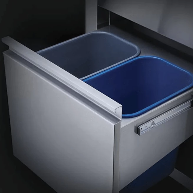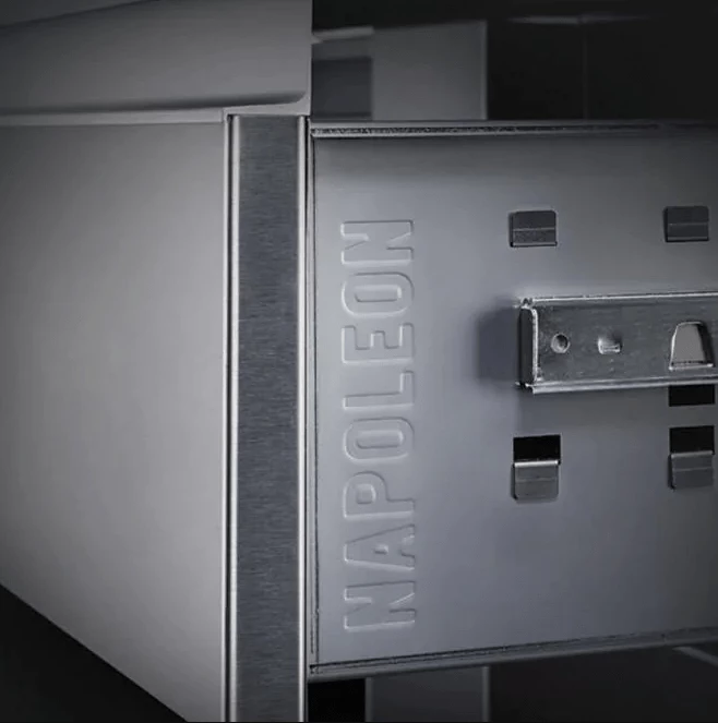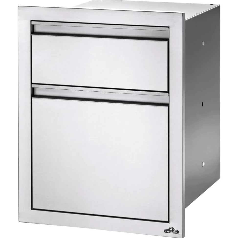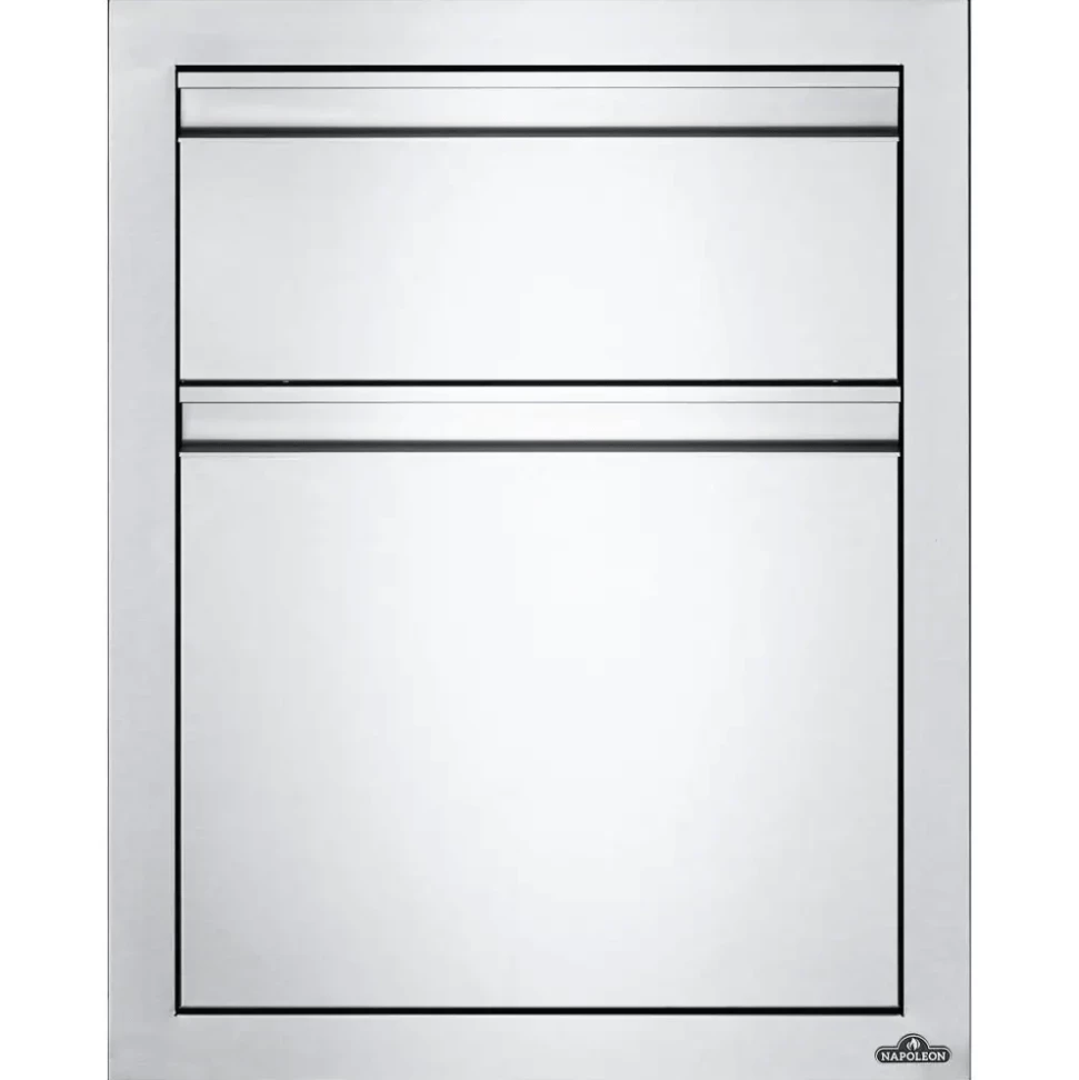 Creating your own custom grill island has never been easier with Napoleon’s Built-In Components. Every great outdoor kitchen needs storage; this double drawer cabinet features waste and recycling bins that can double as storage as well as a paper towel pull out. Stainless steel construction, soft closing hardware, seamless trim, and anodized aluminum handles provide durability and endless installation possibilities.