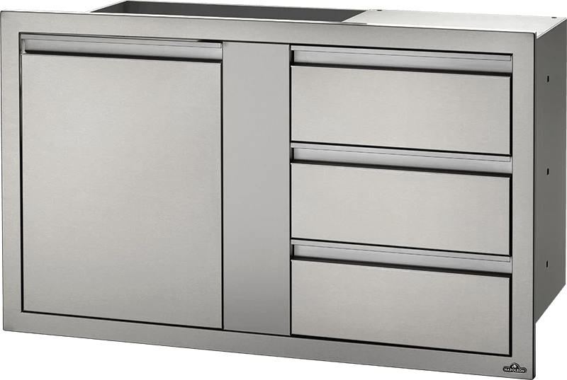 Creating your own custom grill island has never been easier with Napoleon’s Built-In Components. Every great outdoor kitchen needs storage; this 42″ x 24″ built-in component has everything you need for storage. Featuring three drawers and a single large door for storage. The stainless steel construction, soft closing hardware, seamless trim, and anodized aluminum handles provide durability and endless installation possibilities.