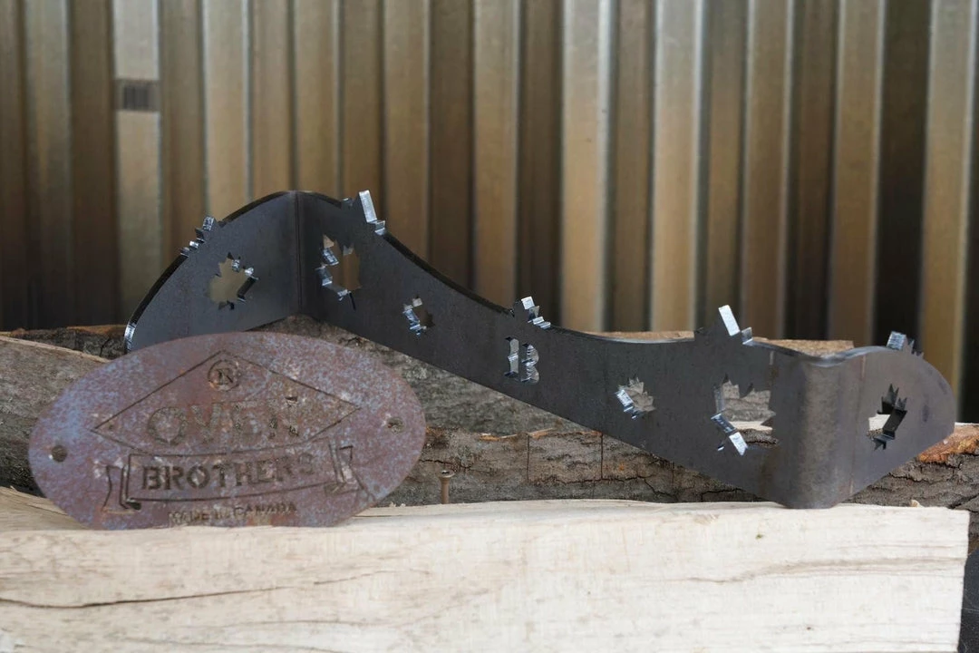 The trendy Oven Brothers Log Holder! Made of sturdy laser-cut carbon steel, this holder will hold your wood in place with its maple leaf spikes and shape. Behold the Holder!