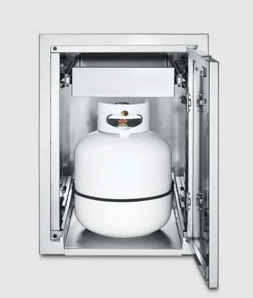 Create a uniform look throughout your Crown Verity outdoor kitchen using our Large Built-In Cabinet. Made of 304 stainless steel construction and featuring a propane tank holder drawer and a single storage drawer, this built-in component will compliment any Crown Verity Built-In grill. Holds a 20 lbs propane tank.