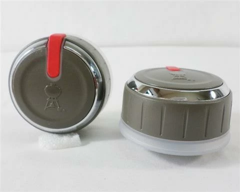 Set of 2 “lighted” main burner control knobs for Weber Genesis II “LX” (model years 2017 and newer). The 2-7/8″ diameter knobs feature a gray plastic body with chrome trim, translucent skirt for emitting light, a red position indicator and a rain boot on the valve stem shaft. The valve stem shaft extends 3/8″ beyond the bottom edge of the knob. Genuine Weber Part.